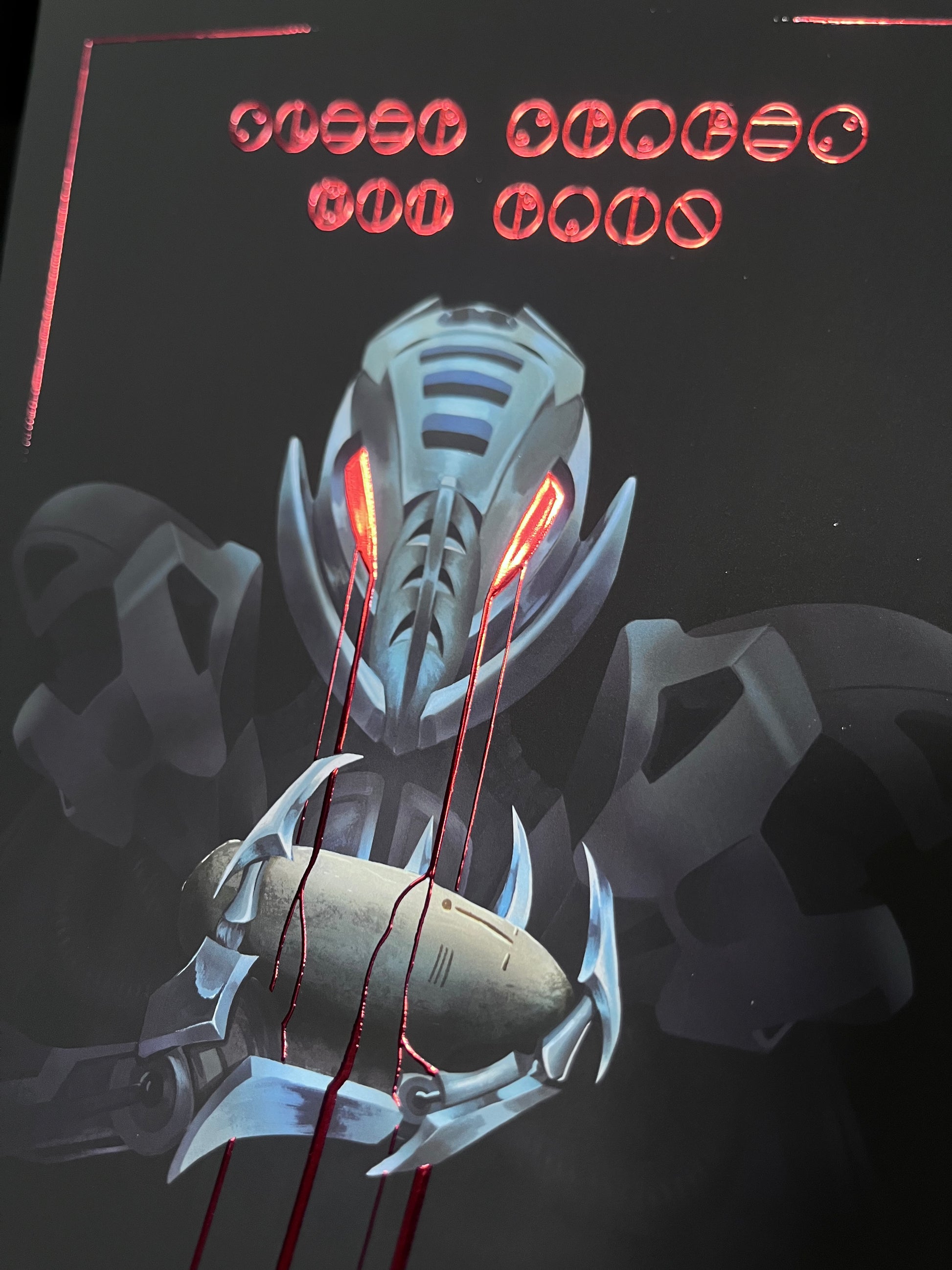 A4 (8x11") or A3 (11x17") print of Makuta Teridax from Bionicle universe printed on 250 g/m² matte photo paper with soft skin finish. Red parts of the print are in red metallic foil with nice 3D touch. A perfect gift to any Bionicle fan!